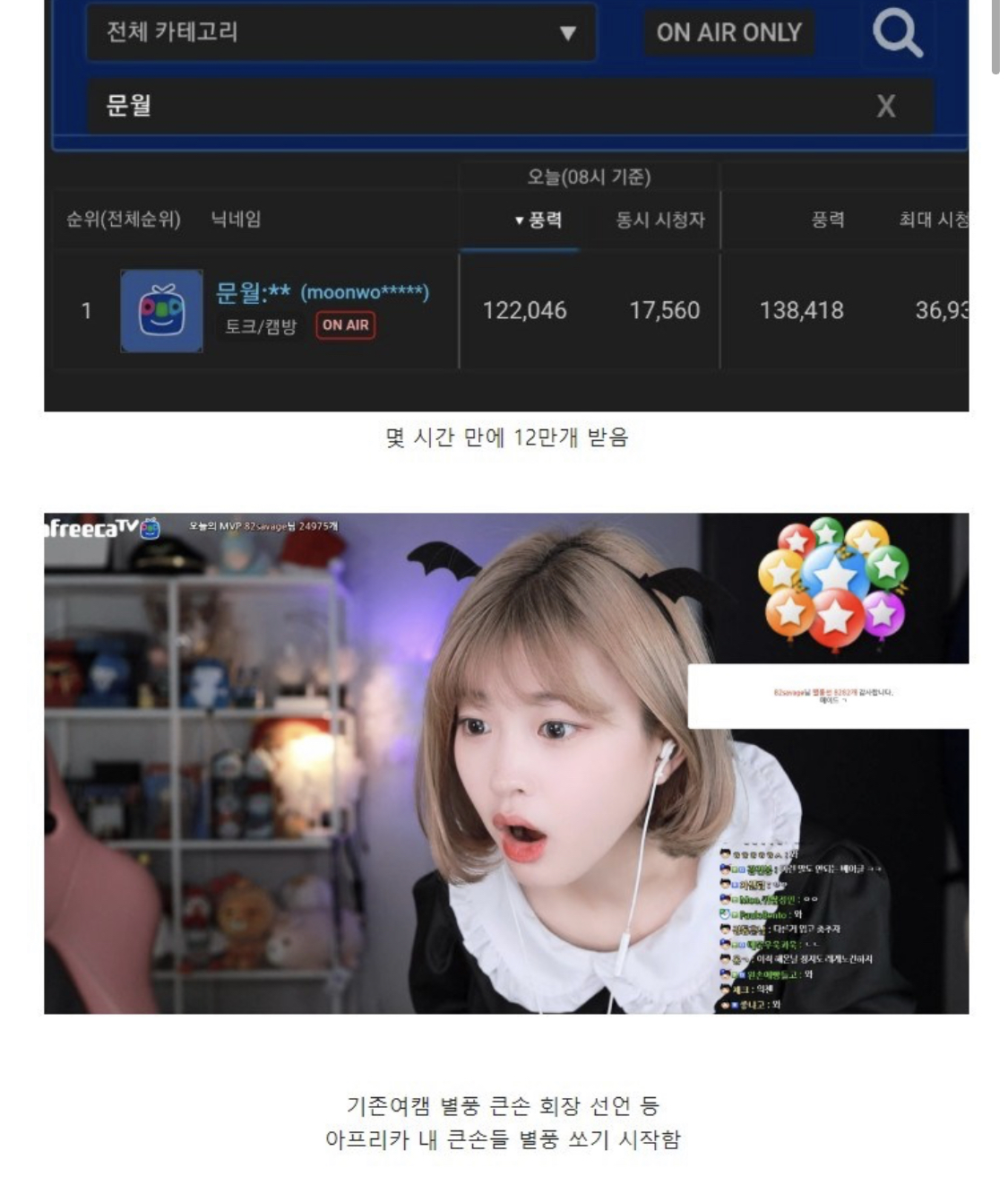 왼쪽 상단에 별풍선 순위 보이시나요? 문월님 방송 1~10등까지 당일 후원자만 저 정도 입니다.. 역시 연예인이랑 BJ들 수입은 어마어마 합니다