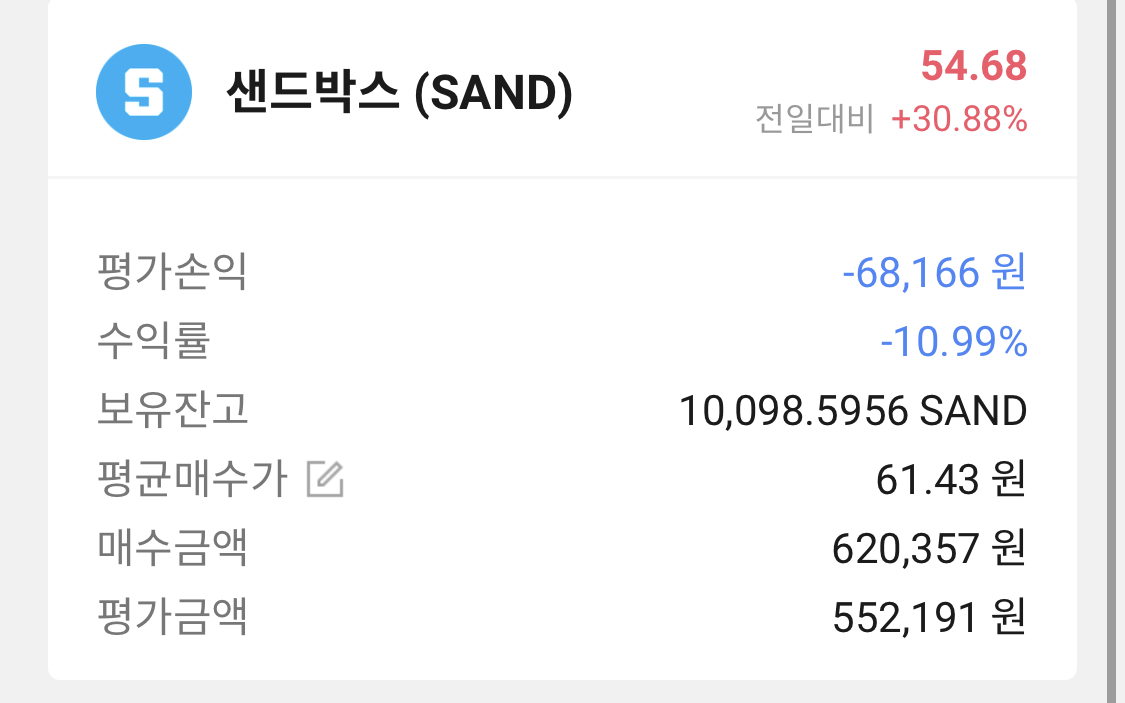 현재 샌드 코인은 폭락장을 맞아 45~55원대를 왔다갔다 하는 중이며 빗썸내에 상장후 누군가의 장난으로 1분만에 240원까지 급등했다 떨어지는등 거래소 내에서도 화재거리이기도 하다 나는 이 코인에 1만개 정도 투자했고 수익률은 ㅠㅠ.. 일단 존버해야겠지?;;