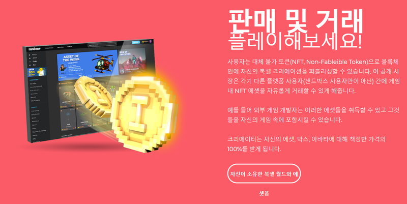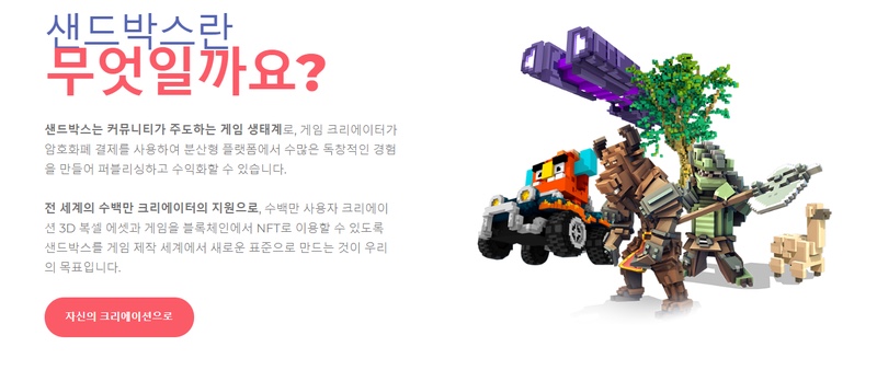 우선 더 샌드박스 코인은 TSB게이밍이라는 회사에서 가상세계 게임 '더 샌드박스' (마인크래프트와 비슷한 게임)내 에서 유저들이 마인크래프트처럼 아이템,캐릭터,맵 들을 만들면 가상화폐를 지급해주는 시스템으로 운영된다 일종의 리워드인셈 만약 샌드코인이 떡상을 한다면 게임만으로도 억만장자가 가능해진 셈이다 . 이처럼 가상화폐의 장르도 다양해지고 있는 만큼 국가들의 가상화폐에 대한 솔루션이 확립되길 기원한다.