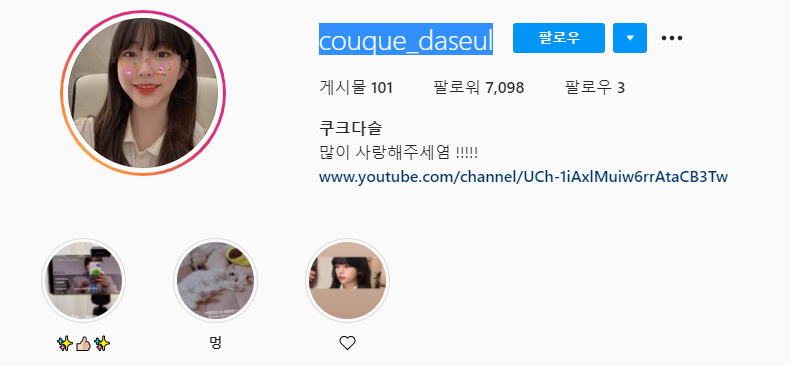 다슬님 인스타 아이디는 @couque_daseul 이다. 많은 분들이 bj명이나 인스타 아이디를 쿠쿠다슬이라 착각하는데 쿠크다스같은 멘탈이라 해서 귀엽게 쿠크다슬로 작명했다고 한다