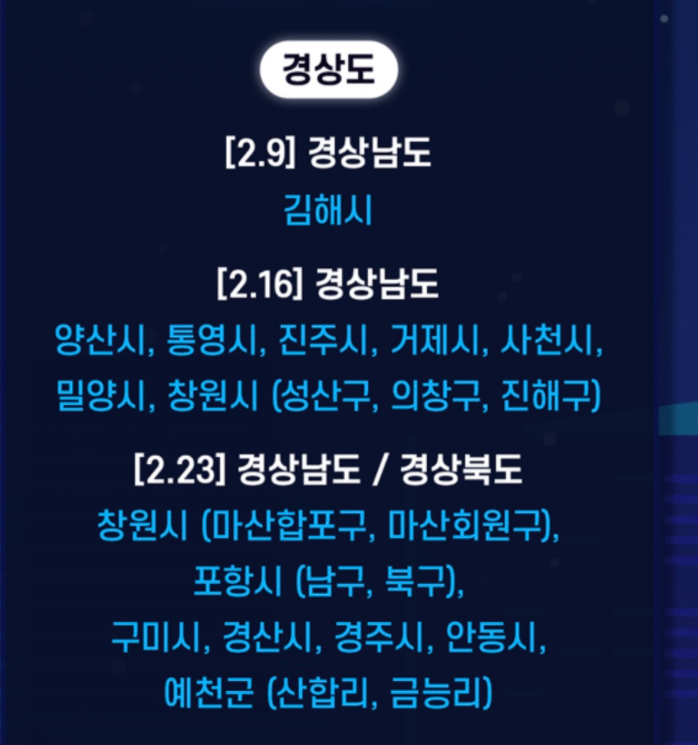 김해를 시작으로 양산, 통영, 진주, 거제, 사천, 밀양, 창원, 포항, 마산, 구미, 경산, 경주, 안동, 예천 등이 대상 도시이고