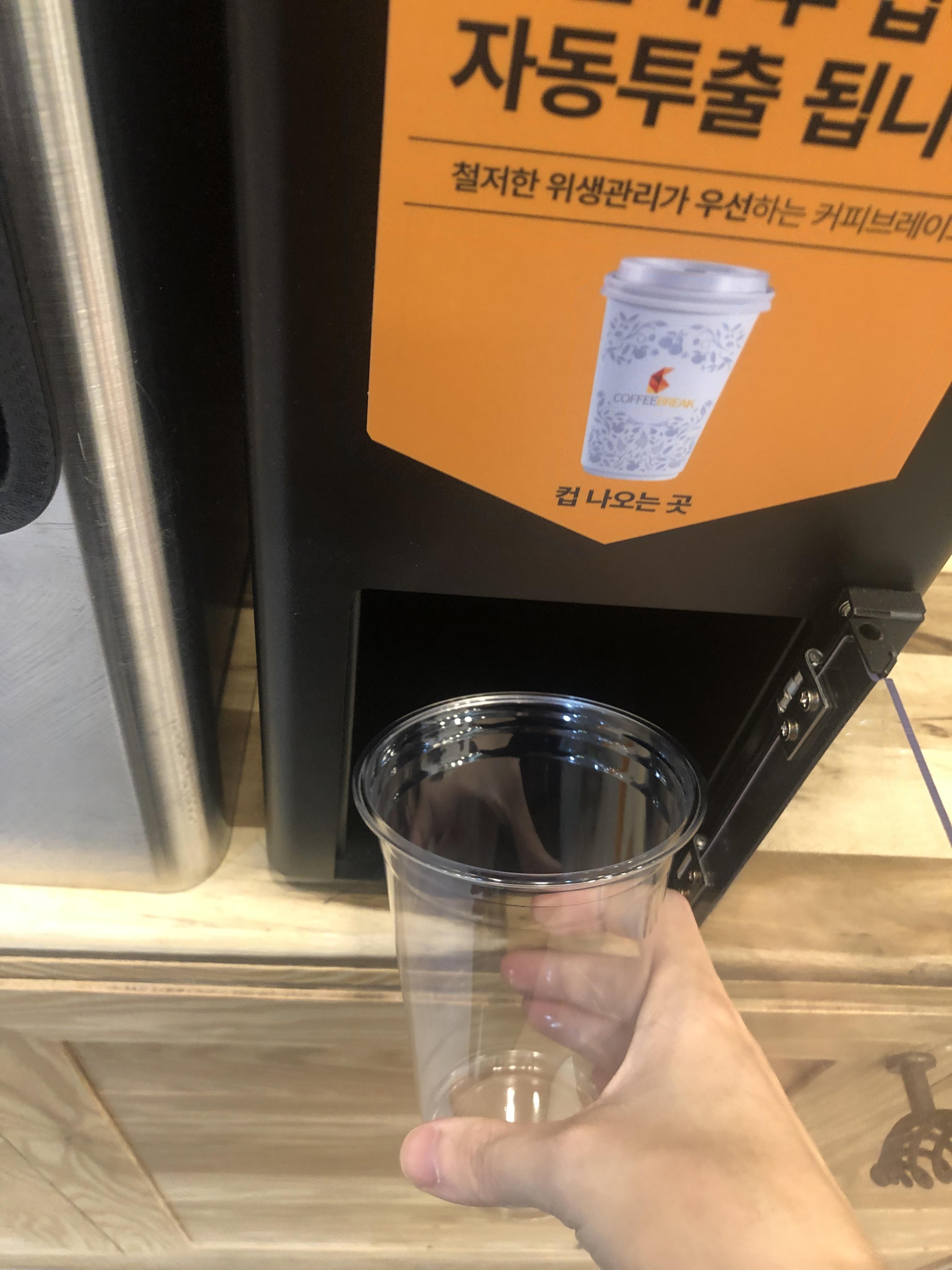 다른매장에서는 컵 -> 얼음 -> 커피 이 순서가 자판기 한개에서 바로 끝이나던데 이 매장은 처음이용하는 고객들은 사용에 어려움을 겪을수도 있겠다 생각됨.. 아마도 자판기 가격을 최대한 저렴하게 하기위해 한 선택인듯 하다.