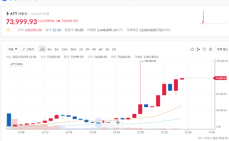 코인원에서 아튜브(ATT)라는 코인을 상장했는데 한시간만에 50원짜리가 무려 1500배 (15만%)가 떡상해 버린것인데....
