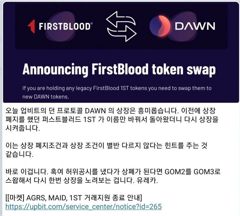 어느정도 공부를 하고 투자를 했던 분들은 다들 아는 소식이겠지만 사실 던프로토콜은 퍼스트블러드라는 이름으로 이미 업비트에 상장을 했었으며 거래 조건 미달로 인해 상장폐지까지 당한 종목입니다.