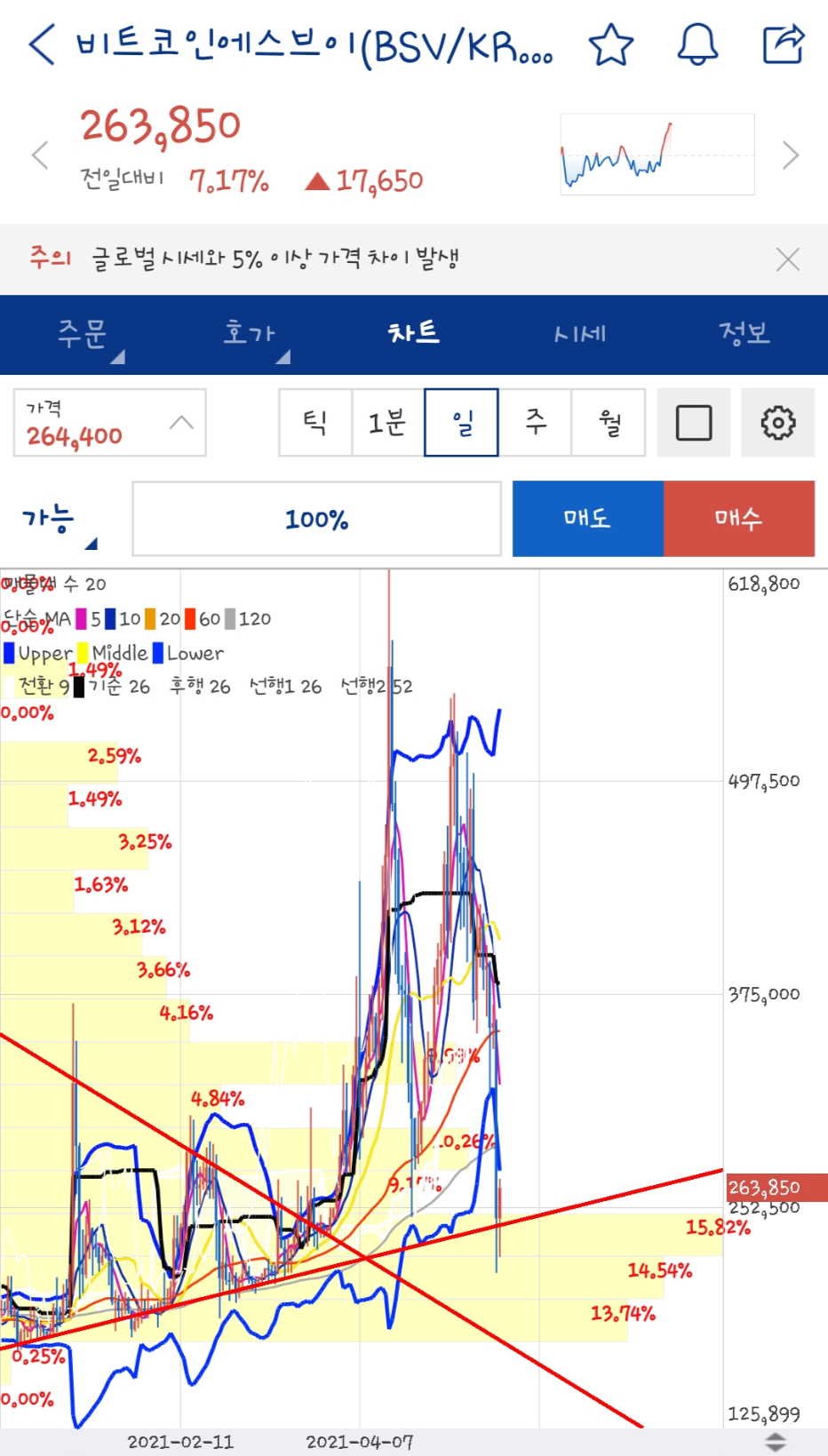 위 사진을 보면 아시겠지만 비트코인에스브이는 아직 볼린저밴드선(위아래로 이어진 2개의 굵은 파란포물선) 아래에 위치한 상태, 이 부분은 이전 하락장에서 항상 강조했던 부분이기 때문에 설명은 생략하겠습니다.(설명은 아래 링크 참조)