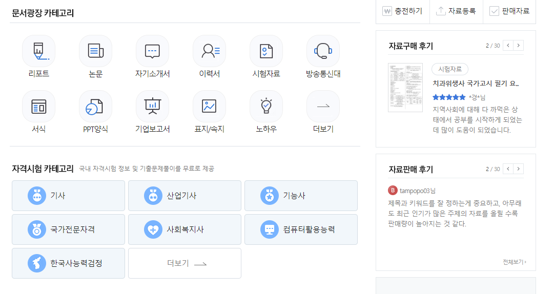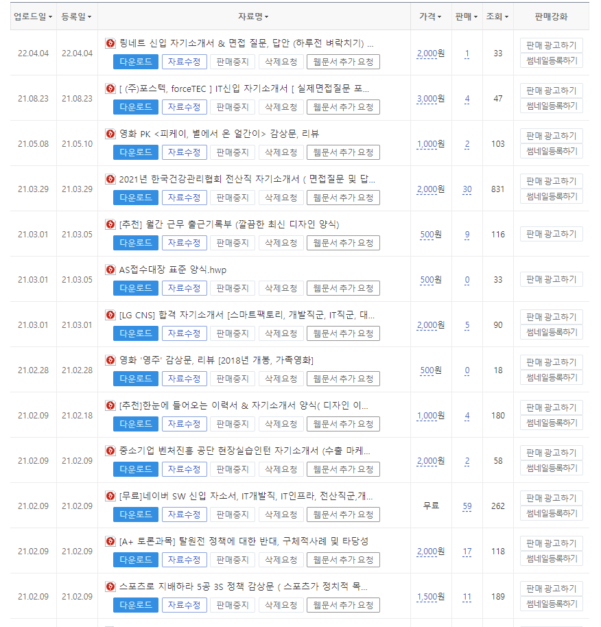 자소서나 감상문 혹은 토익이나 자격증 공부에 필요한 정리자료나 노하우 나같은 경우 컴공과 출신이라 소프트웨어 프로젝트를 하며 모아놓은 코드도 판매하고 it기업에 지원할때 작성했는 자소서나 교양과목에서 작성했는 레포트 자료들까지 올려두었는데 이게 과연 팔릴까 싶었는데 생각보다 정말 잘팔린다.