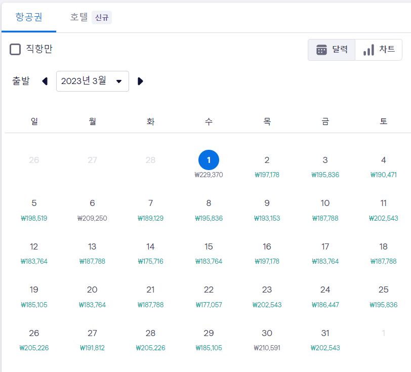 비행기표는 매일 가격이 변동될 정도로 가격 편차가 정말 크기 때문에 특정일을 기준으로 구매하는 것보다 한달 차트를 보고 가장 저렴한날의 가격이 얼마인지 우선 체크한 다음, 실제로 탑승하고 싶은 날짜와 가격 비교를 하여 과연 이 가격이 합리적인지 확인하는 것을 추천드립니다.